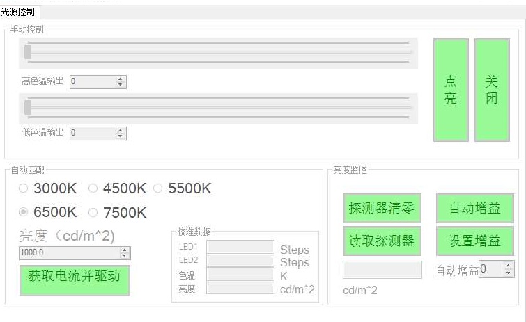 系統(tǒng)軟件界面如下圖。軟件界面清晰直觀,可手動調節(jié)LED的電流大小,也可按照步數輸入期望的數值,實現精細調節(jié),實際調節(jié)精度遠大于2星等。