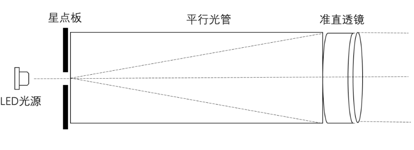 星光模擬器由LED光源,星點板,平行光管,準直透鏡,驅動電源,控制軟件等組成。通過調節(jié)LED的驅動電流實現不同級別的亮度輸出,從而實現不同星等亮度要求。