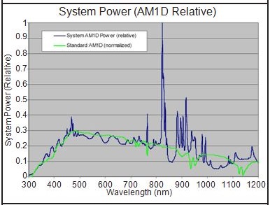 上圖顯示了努美科技/Sciencetech全反射太陽(yáng)能模擬器的典型輸出光譜。這些光譜輻照度曲線結(jié)合了氙弧燈光源,空氣質(zhì)量過(guò)濾器和太陽(yáng)模擬器光束均化器內(nèi)部使用的反射鏡的光譜曲線。