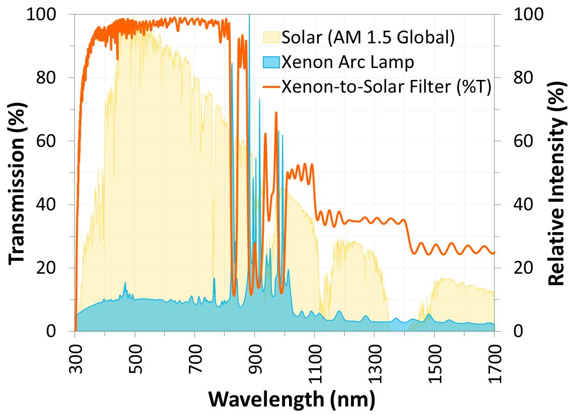 圖1.獨(dú)特的定制光學(xué)濾光片,旨在塑造氙弧燈的光譜,使其與太陽(yáng)光相似。